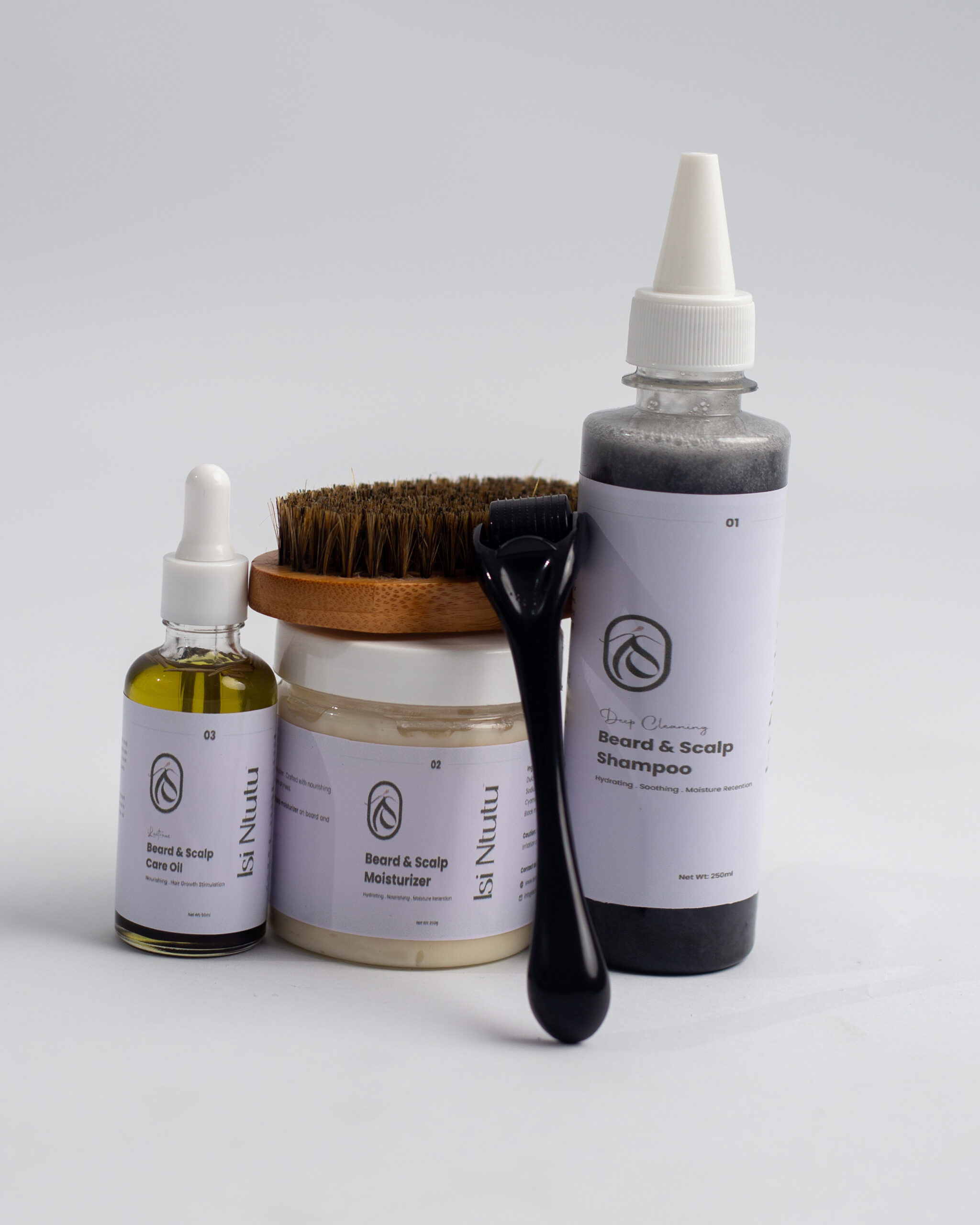 Lustrous beard & scalp shampoo, beard & scalp moisture sealant, lustrous beard & scalp care oil, hair brush and derma roller